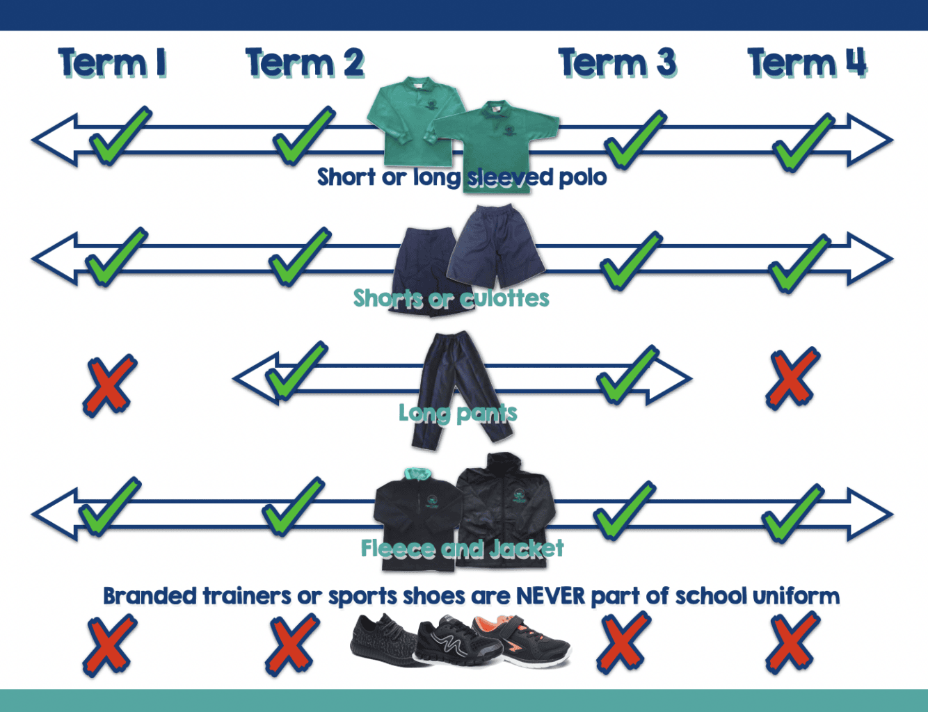 Trousers: Available as an option during the cooler months (Terms 2 and 3).